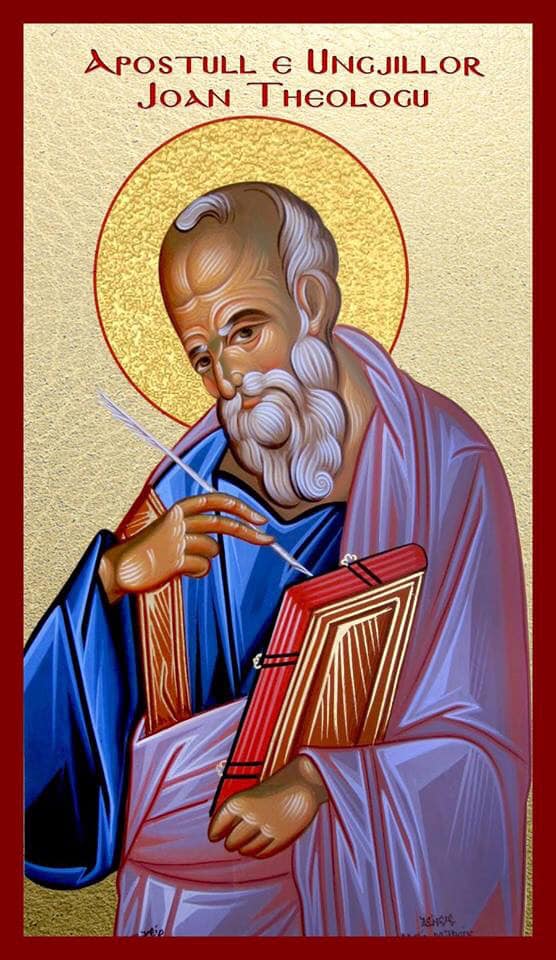 Ungjillori i dashurisë shën Joani. Ai ishte nga nxënësit më të afërt të Krishtit. Jetoi nga afër gjithë veprimtarinë e Zotit, pa mrekullitë e mëdha që kreu dhe dëgjoi predikimet e Tij. Ishte i vetmi që e ndoqi deri në Kryq Jisuin dhe Zoti, nga lartësia e Kryqit, kur pa përkushtimin e tij plot dashuri, i ngarkoi mbrojtjen dhe përkujdesjen e Nënës së Tij. Kështu, qysh nga ai çast, Joani e mori të Tërëshenjtën në shtëpinë e vet dhe iu gjend si bir deri në Fjetjen e saj. Vdiq në pleqëri të thellë, rreth vitit 100 pas Krishtit duke predikuar: “Bij të mi, duajeni njëri-tjetrin dhe është mjaft”.