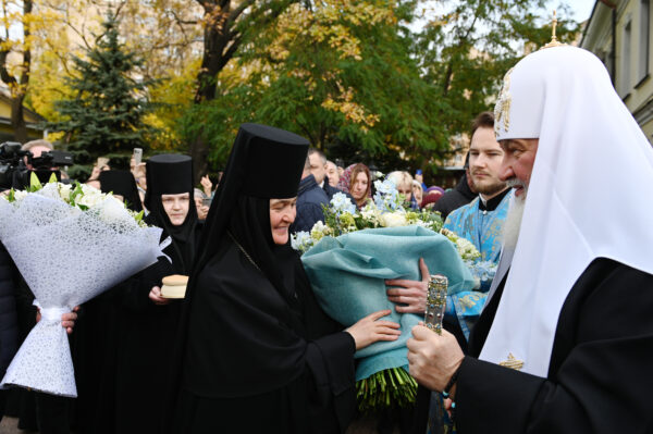 Preafericirea Sa a dăruit mănăstirii, la finalul Sfintei Liturghii, un set de acoperăminte pentru Sfintele vase. În semn de recunoștință, Maica stareță Teofania a oferit Patriarhului Kirill o icoană cu Acoperământului Maicii Domnului.