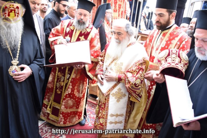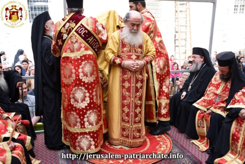 După ce a oficiat Liturghia Sfântului Vasile cel Mare în Catedrala Sfântul Iacob din Ierusalim, Patriarhul a spălat picioarele, potrivit tradiţiei, a 12 clerici, pentru a comemora evenimentul petrecut acum peste două mii de ani.
