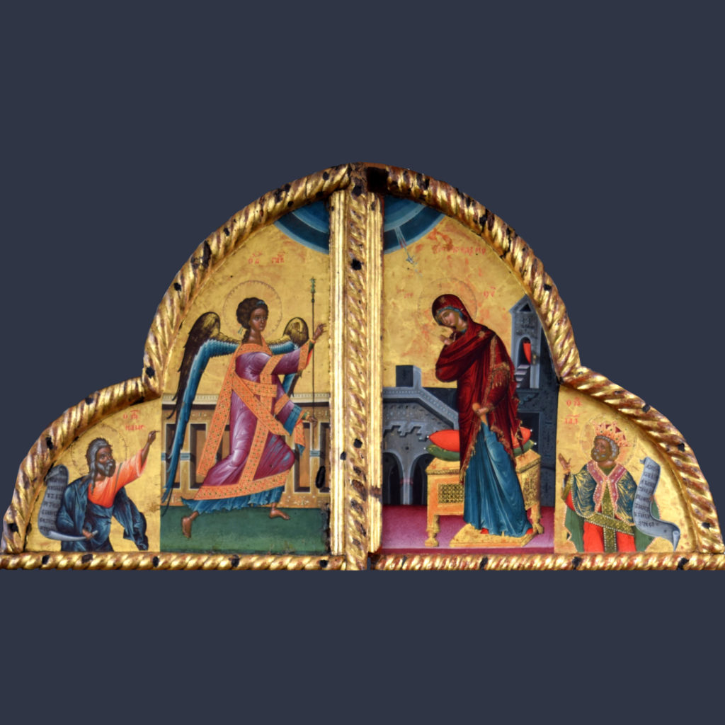 Këto dyer janë prej veprave më të bukura që pikturoi mjeshtri i madh dhe shpalosin mjeshtërinë dhe talentin e tij të jashtëzakonshëm. Në sfondin e artë ku shihen ndërtesa antike paraqiten Gabrieli dhe virgjëresha Mari e cila mer prej tij lajmin e mirë. Ajo e pranon me përulësi vullnetin hyjnor. Gjithçka është punuar me finesë të lartë deri në detajet më të imta. Koloriti brilant intesifikohet edhe prej arit. Në të dy anët shihen profetët David dhe Solomon që mbajnë në duar pergamenat me shkrimet e shenjta.