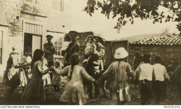 And the writings and letters of Australian and other Allied soldiers who came to Imbros include many references to their interaction with the local Hellenic population, visiting the local churches, eating their food and the local beverages. Photographs from the time show Australians interaction with the locals, being invited into their homes. Charles Bean would photograph some of the medieval ruins on the island and Phillip Schuler some of the iconic environment of Imbros.