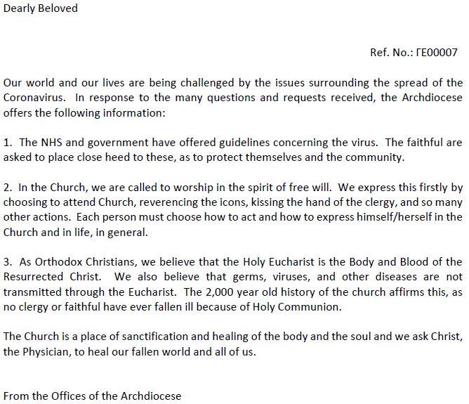 The Greek Orthodox Archdiocese of Thyateira and Great Britain has released a statement offering information about the coronavirus.