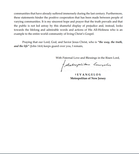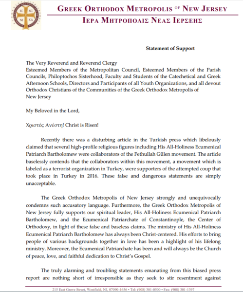 GREEK ORTHODOX METROPOLIS OF NEW JERSEY : Support for His All-Holiness Ecumenical Patriarch Bartholomew re: Turkish Press Statements