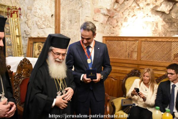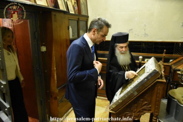 Mitsotakis was first welcomed at the Patriarchate’s main gate by the Jerusalem Patriarch and elders of the Hagiotaphite Brotherhood.