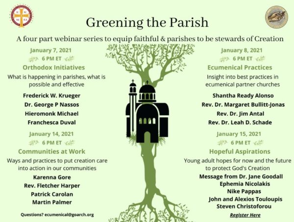 The Department of Inter-Orthodox, Ecumenical and Interfaith Relations is pleased to announce a four-part webinar series on Greening the Parish launching in January 2021. The series will feature conversations between expert panelists on what it means to be a steward of creation through the lens of our Orthodox Christian theology, best practices, and daily action.