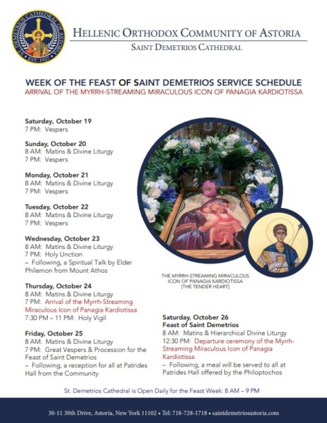 The Hellenic Orthodox Community of Astoria warmly invites you and your loved ones to join in celebrating the week of the feast of Saint Demetrios the Myrrh-Streamer and Great Martyr, the patron saint of their Cathedral, every day this week until Saturday, October 26, 2024.