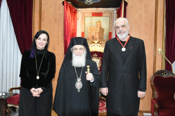His Beatitude Theophilos III, the Patriarch of Jerusalem, received today Tuesday, January 27, the Prime Minister of the Republic of Albania, His Excellency Edi Rama and his wife, at the headquarters of the Jerusalem Patriarchate. The meeting came as part of a regional tour by the Albanian official.