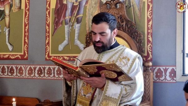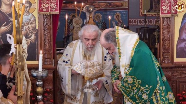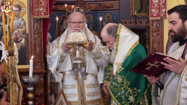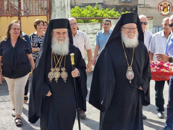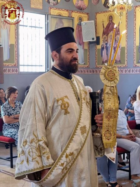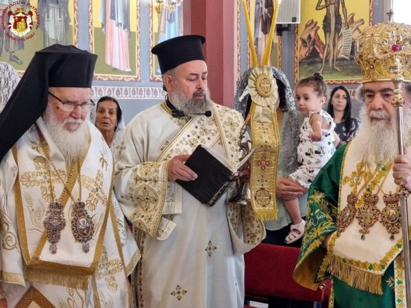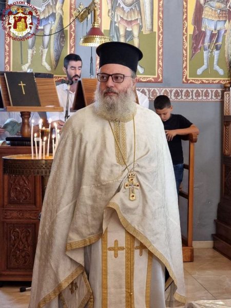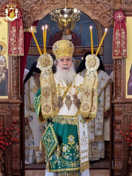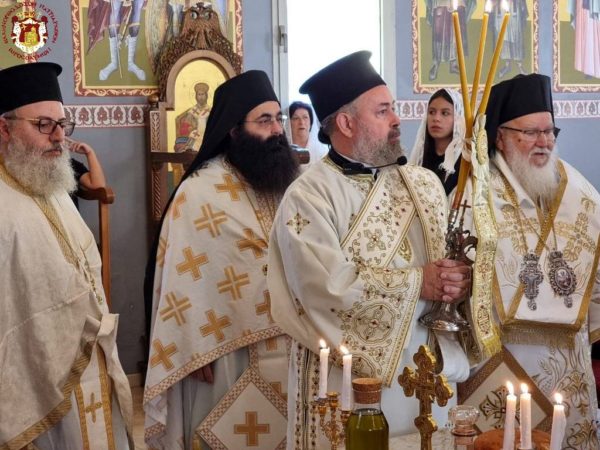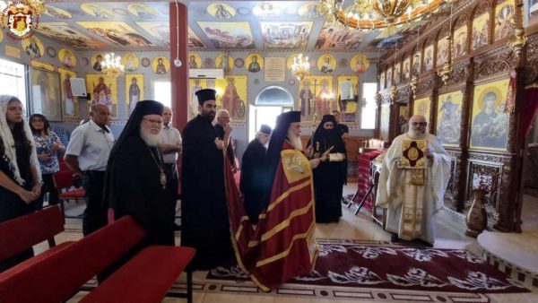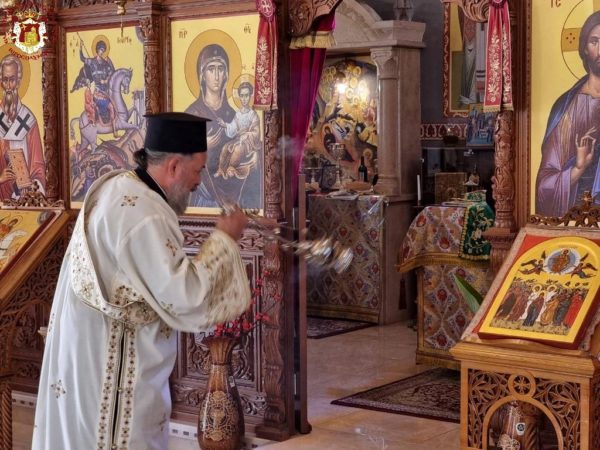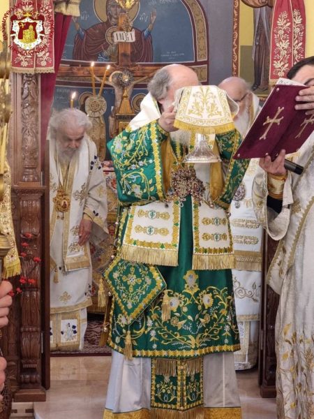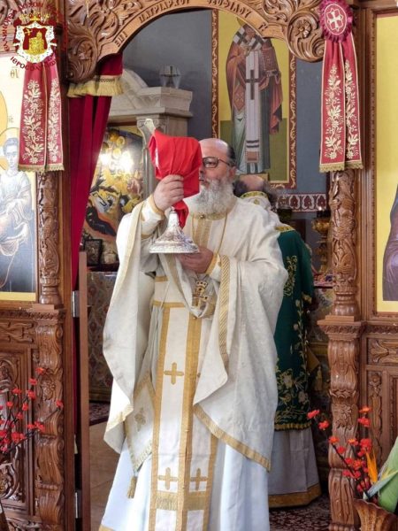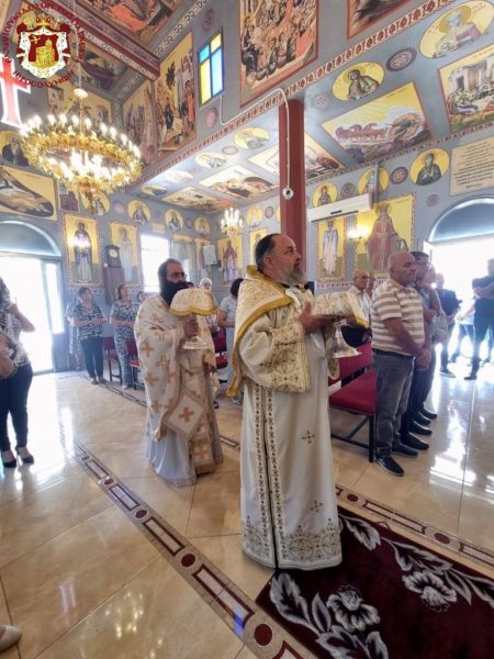 Concelebrating with Him were His Eminence Metropolitan Kyriakos of Nazareth and His Eminence Archbishop Aristarchos of Constantina, along with Hieromonks of the Brotherhood of the Holy Sepulchre, led by the Hegumen of the Holy Monastery of the Precious Cross in Jerusalem, Archimandrite Christodoulos, the parish priest Fr Ioannis, and other priests from the region, Archdeacon Mark, and Hierodeacon Eulogios. The devout faithful of the parish participated in the service, with the parish choir chanting.