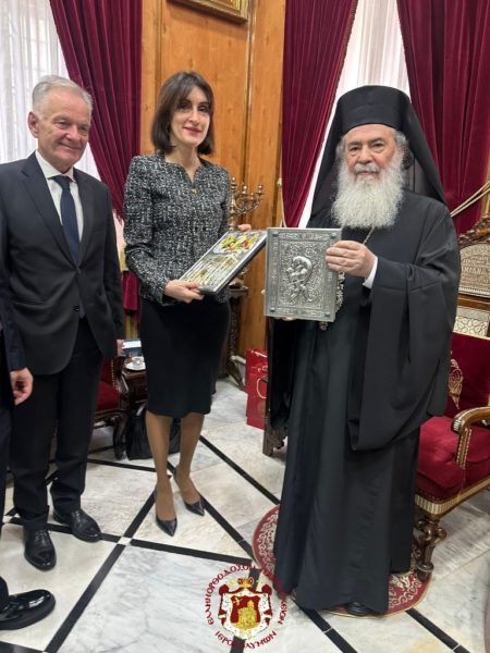 As a gesture of friendship, His Beatitude presented the Minister with an icon of the newly restored Sacred Edicule, and she offered a Georgian gift in return, seeking his blessing to venerate the Holy Sepulchre.