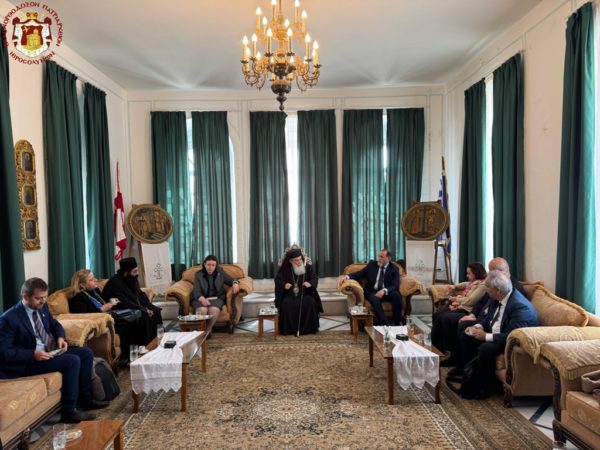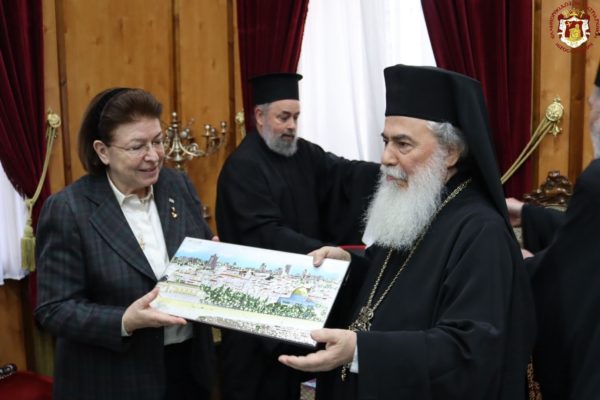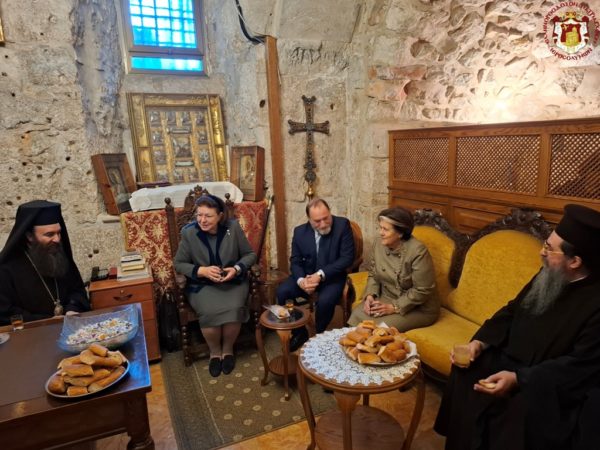 His Beatitude Theophilos III welcomes Greek Minister of Culture Lina Mendon at the Patriarchate of Jerusalem