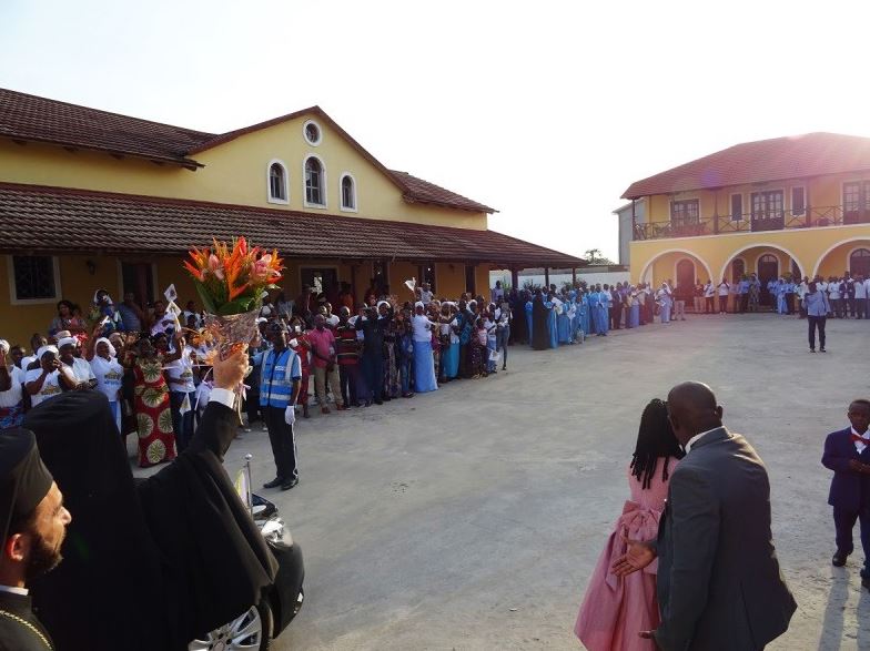 At the Augustino Neto International Airport His Beatitude was welcomed by His Excellency Mr. Alexandre Honoré Paka, the Clergy, the Senior military and civil authorities of the city and crowds of faithful.