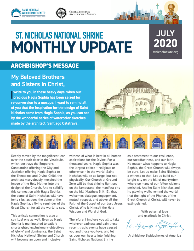 I write to you in these heavy days, when our precious Hagia Sophia has been seized for re-conversion to a mosque. I want to remind all of you that the inspiration for the design of Saint Nicholas came from Hagia Sophia, as you can see by the wonderful series of watercolor sketches made by the architect, Santiago Calatrava.