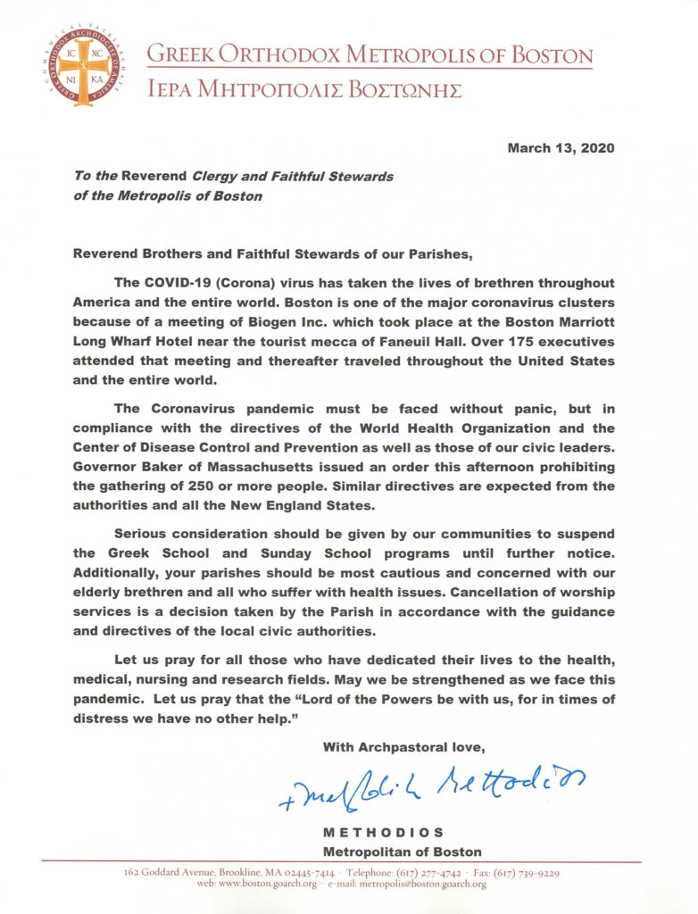 His Eminence Metropolitan Methodios of Boston issues statement concerning COVID-19 (Coronavirus)