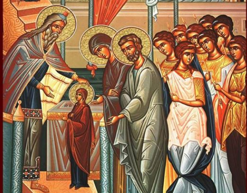 Kur fëmija e shenjtë dhe e dëlirë, që u dha nga Perëndia për gjininë njerëzore që mbeti shterpë për shkak të mëkatit, të pasioneve dhe vdekjes, arriti moshën 2-vjeçare, i ati, Joakimi, i tha së shoqes: “Le ta çojmë në tempullin e Zotit, që të përmbushet premtimi që bëmë, për ta dedikuar që në moshë të re tek i Tërëfuqishmi”. Por Ana u përgjigj: “Le të presim deri në tre vjet, se ndoshta kërkon të atin e të ëmën dhe s’qëndron në tempullin e Zotit.”
