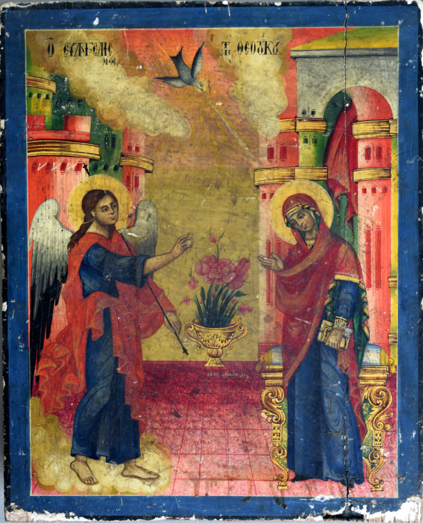 Ikona paraqet një prej skenave kryesore në artin bizantin, skenën e Ungjëllizimit . Skena është vendosur në një ambjent të jashtëm ku Kryeëngjëlli Gabriel jep lajmimin tek Shën Mëria në lidhje me shtatzaninë e saj të shenjtë.