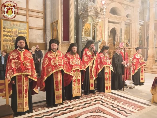 H.H.B. our Father and Patriarch of Jerusalem Theophilos presided over the Doxology, with the co-celebration of the High Priests and Hieromonks of the Hagiotaphite Brotherhood, in the presence of the Consul General of Greece in Jerusalem, Mr Evangelos Vlioras and members of the Greek Consulate General. The chanting was delivered by His Eminence Archbishop Aristovoulos of Madaba, and Mr Gotsopoulos in the presence of members of the Greek community and pilgrims.