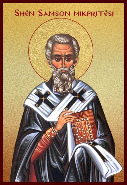Me të vërtetë, monarku mirënjohës, midis kishave të Shën Sofisë dhe të Shën Irinit, ngriti një spital madhështor dhe të famshëm, “Spitalin e Samson Mikpritësit”, siç e quajti. Mbajtjen e tij e siguroi nëpërmjet pronave të dhuruara. Oshënari e drejtoi atë deri sa fjeti. Varrimi u krye në kishën e shkëlqyer të Shën Mokiut (11 maj), që thuhet se ishte i afërmi i tij. Më parë ishte hirotonisur prift i Shën Sofisë prej patrikut Shën Mina (25 gusht). Por, thuhet se patriku shërbeu si drejtor i spitalit, ndërsa ishte akoma prift. Justiniani, për më tepër, e kishte ngarkuar Mikpritësin ruajtës të enëve të Kishës së Madhe, d.m.th. të Shën Sofisë.