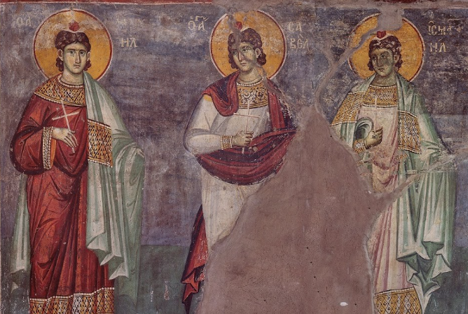 Por kur Julian Shkelësi dhe oborrtarët e tij bënin flijime te perënditë gjatë festës, të tre të dërguarit qanin mënjanë për adhurimin e demonëve. I pikasën, dhe meqenëse ata nuk u bindën për të bërë edhe ata flijime, u burgosën nga perandori. Ky i fundit më kot u përpoq ditën e nesërme që t’i trembte, i torturan dhe fshikulluan derisa u mbuluan me gjak; i gozhduan në duar e këmbë në dërrasë dhe i varën; i gërvishën me thonj hekuri, saqë u binin mishrat. Ndërsa luteshin u shfaq engjëlli që u zbuti dhimbjet e padurueshme.