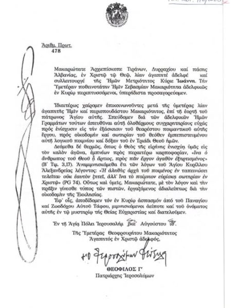 Gëzohemi në mënyrë të veçantë që po komunikojmë me Ju, Fortlumturi i shenjtë dhe i nderuar, në të kremten e Shenjtorit, emrin e të cilit mbani. Përmes këtyre letrave vëllazërore, nxitojmë t’ju përçojmë urimet tona të përzemërta, që të jeni të fortë në kryerjen e veprës suaj baritore për rritjen shpirtërore dhe shpëtimin e grigjës suaj të arsyeshme që ju është besuar prej Perëndisë, si edhe për lavdi të Perëndisë tonë Triadik.