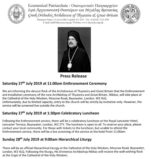The Enthronement Ceremony of the new Archbishop of Thyateira and Great Britain, Nikitas, took place on Saturday, July 27, 2019 at the Cathedral of the Holy Wisdom, Bayswater, London.