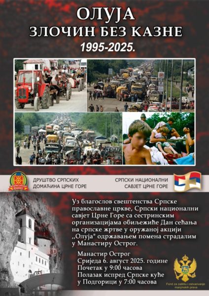 05/08/2025 05/08/2025 Српски национални савет Црне Горе, као и претходних година, са сестринским организацијама обележиће Дан сећања на српске жртве у оружаној акцији „Олуја“ поменом страдалима који ће бити служен 6. августа 2025. године у манастиру Острог, са почетком у 9 часова. Из Подгорице је организован полазак испред Српске куће у 7 часова.