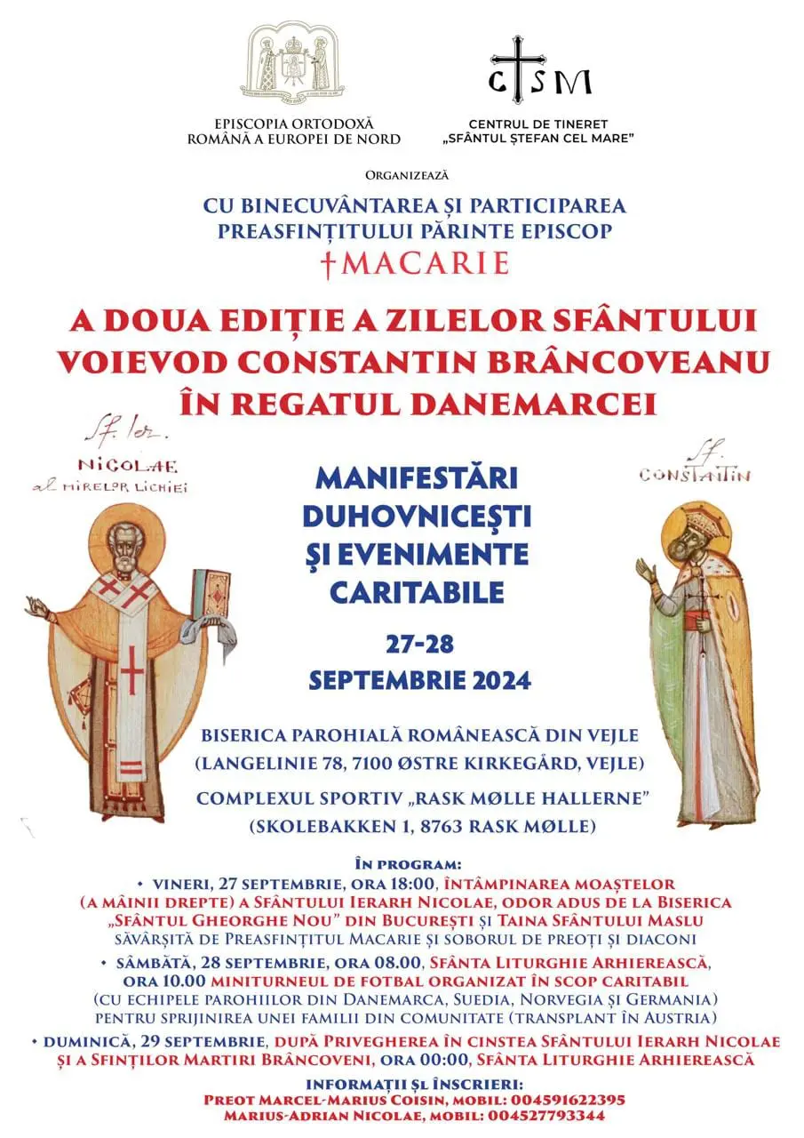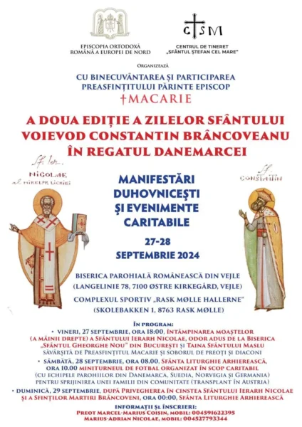 Episcopia Europei de Nord organizează „Zilele Sf. Voievod Constantin Brâncoveanu în Regatul Danemarcei” la biserica românească din Vejle-Kolding, în Peninsula Iutlanda. Seria de manifestări începe vineri, când mâna Sf. Nicolae de la parohia bucureșteană „Sf. Gheorghe” – Nou ajunge în pelerinaj în această comunitate românească din diaspora.
