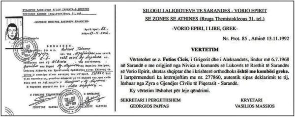 Në fillim të viteve ’90, Foti Cici (për sqarim, emri i tij i mëparshëm ishte Fatmir, të cilin e ndërroi ligjërisht në Fotaq, ndërkohë që paraqitet me formën Foti), largohet si emigrant në Greqi, ku deklaron se është minoritar me origjinë greke dhe lidhet me Mitropolitin e Konicës, Sebastianos. Edhe deklaratën e tij për origjinën greke, Foti është përpjekur ta mbajë po ashtu të mbuluar, por e vërteta nuk fshihet në mjegull. Kështu, doli në dritë dokumenti, që vërtetonte mohimin e origjinës së tij shqiptare, ndërsa deklaronte atë greke.(Shih bashkëngjitur dokumentin, foto nr.2). Duke u hequr si mbështetës i ideve të Sebastianosit, ia doli të përfitonte prej tij një bursë studimi për teologji në Universitetin e Athinës. Studimet në këtë universitet Foti i përfundoi pas 7 vjetësh, duke tejkaluar periudhën normale katër vjeçare studimore, gjë që i solli edhe ndërprerjen e bursës së studimit.