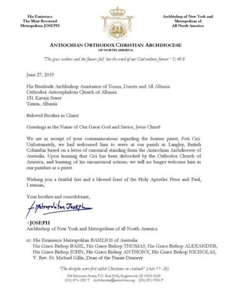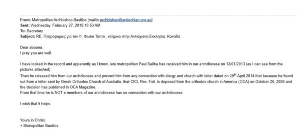 I dëbuar nga Australia, Foti kthehet përsëri në Kanada. Duke mos e harruar zakonin e vjetër, ai përdor mënyra e mjete të ndryshme për të fshehur qëllimet dhe groposur gjurmët e së shkuarës. Me këtë mënyrë arrin të depërtojë dhe të pranohet nga Kisha Orthodhokse e Antiokisë që vepron në Kanada. Edhe këtu gënjeshtra nuk e çoi larg, sepse siç thotë proverbi “Gënjeshtra bën vegshin, por nuk ia vë kapakun”. Si mësoi të vërtetën, Kryepiskopi i Kishës së Antiokisë, Nju Jorkut dhe gjithë Amerikës së Veriut, Hirësia e tij Josifi, përmes shkresës me dt. 27 qershor 2019 dërguar Kishës Orthodhokse Autoqefale të Shqipërisë, shprehu keqardhje që kishte lejuar një person të tillë gënjeshtërmadh dhe antikanonik të shërbente në një kishë të tij. Njëherësh, njoftonte se ky ishte dëbuar dhe nuk bënte më pjesë në Kishën e tyre. (Shih foto nr. 6)