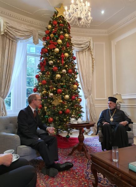 During the visit, His Eminence first thanked his esteemed visitors for their time and interest in the Orthodox Community in the United Kingdom. He then shared his vision for the Greek Orthodox Archdiocese and discussed issues of mutual interest, concerning the societal role of the Church in the United Kingdom, and especially about the effects of the current pandemic and ways to respond to the challenges. He also expressed his personal commitment as well as that of the Archdiocese collectively, to participate in inter-religious and inter-Christian initiatives bettering social cohesion and cultivating a culture of solidarity among all people here. The meeting ensued with discussion about matters pertaining to the Ecumenical Patriarchate, Hagia Sophia, Chora Monastery, the Mediterranean world, as well as matters facing religious communities here and throughout the world. The Archbishop thanked his esteemed guests once more and requested that they convey to the Rt. Hon. Boris Johnson, the Prime Minster, the festive Christmas greetings of His All-Holiness Ecumenical Patriarch Bartholomew as well as the collective prayers and tidings of the Greek Orthodox Archdiocese of the United Kingdom.