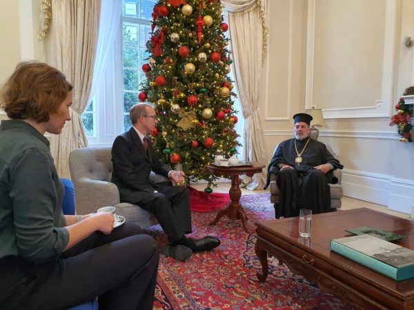 On Tuesday, December 7, 2020, His Eminence Archbishop Nikitas of Thyateira and Great Britain, Exarch of the Ecumenical Patriarch, received Mr. Jonathan Hellewell LVO, Special Advisor to the Prime Minister for Faith Communities, accompanied by the Ms. Elena Narozanski, Special Advisor to the Prime Minister in the No. 10 Policy Unit, at the Archdiocesan Headquarters. The Very Rev. Frs. Nikodemos Anagnostopoulos, Chancellor, Nephon Tsimalis, Director of the Office of the Archbishop, and Mr. Jason Charalambous, Solicitor-Advocate, were present during the meeting.