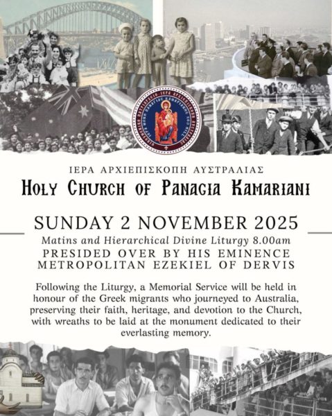 21/10/2025 21/10/2025 The Parish of Panagia Kamariani in Red Hill, Melbourne, will honour the memory of the departed Greek migrants who journeyed to Australia, keeping alive their faith, traditions, and devotion to the Church. On Sunday, 2 November 2025, following the Matins and the Divine Liturgy (beginning at 8:00 a.m.), which will be presided over by His...