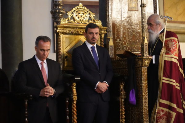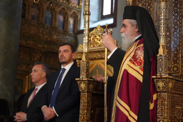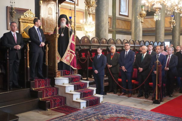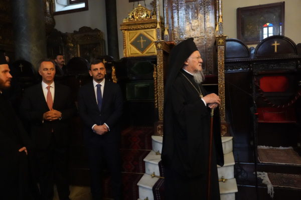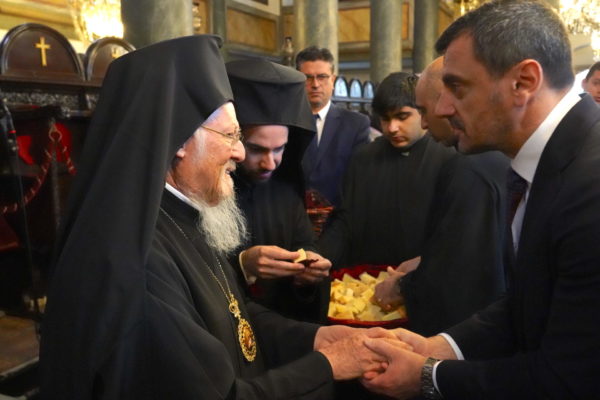 Also present for the Divine Liturgy were, His Eminence Metropolitan Chrysostomos of Myra, the Deputy Minister of Citizen Protection of Greece, Mr. Andreas Nikolakopoulos, the Ambassador His Excellency Konstantinos Koutras, Consul General of Greece in Constantinople, the Mayors of Ancient Olympia Mr. Aristidis Panagiotopoulos, Mr. Efstathios Kannis of Pyrgos and Mr. Ioannis Lentzas of Andravidas-Kyllini, Teachers and students of the 6th Lyceum of Glyfada who are participating in an environmental program of the Patriarchal Foundation for Patristic Studies, and a multitude of believers from the city.