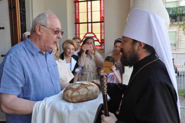 Then Bishop Alexander of Vevey greeted Metropolitan Hilarion and presented him with an Icon of All Saints in memory of the common prayer and a leaflet about the restoration of the church of the Elevation of the Cross.