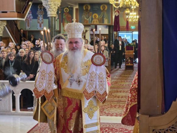 In his reply, Metropolitan Ioustinos spoke with deep emotion. He said that he felt at home, seeing faces of the same origin, and he described the Church of the Transfiguration as “a beautiful church of Australia, which radiates faith and love.” He warmly thanked His Eminence Archbishop Makarios of Australia, who invited him and gave him this opportunity, as well as Bishop Evmenios of Chora for his warm welcome. He also spoke about the importance of the Greek diaspora, which not only keeps faith and language alive, but also confirms that Greek identity can flourish even far from the homeland.