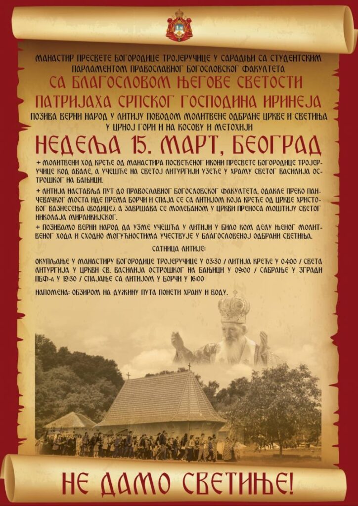 A major rally is being organized for Sunday, March 15, in Belgrade, in solidarity to the Orthodox faithful in Montenegro, where the Patriarch of Serbia, His Holiness Irinej is set to attend.