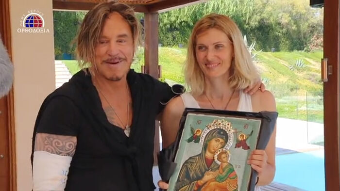 At the conclusion of the interview, the film director Yelena Popovich offered Rourke a hand-painted icon of the Theotokos.