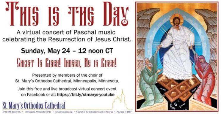 Minneapolis, MN – The choir of St. Mary’s Orthodox Cathedral will present a virtual concert of Paschal music on Sunday, May 24, 2020 at 12 noon CDT. The concert is being offered with the blessing of His Grace, Paul, Bishop of Chicago, ruling hierarch of the Orthodox Church in America’s Diocese of the Midwest.