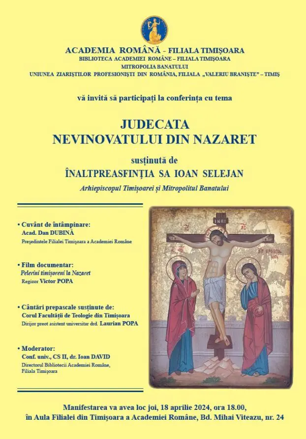 Conferința care va avea loc în data de 18 aprilie, de la ora 18:00, se intitulează „Judecata Nevinovatului din Nazaret”.