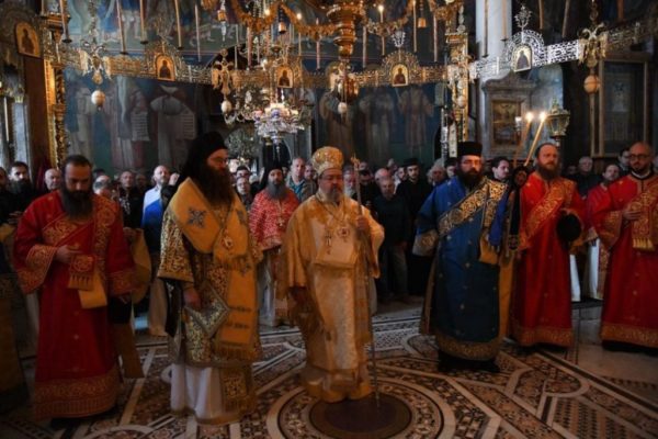 A festal meal followed, and at 7:00 p.m. began the all-night vigil of the feast, presided over by His Eminence Metropolitan Theoliptos. On the right choir chanted the fathers of Vatopedi, as they do each year, while on the left sang the chanters’ choir of Mr. Konstantinos Marinopoulos from Katerini.