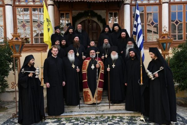 With banners, incense, sacred hymns, and the ringing of bells, the venerable Abbot of the Holy Monastery, Archimandrite Elder Alexios, accompanied by a multitude of hieromonks, monks, and numerous pilgrims, received at the monastery’s gate from the Abbot of the Holy Monastery of Vatopedi, Archimandrite Elder Ephraim, the sacred and wonderworking relic, the Holy Belt, and, in procession, carried it into the Katholikon.