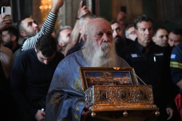 With banners, incense, sacred hymns, and the ringing of bells, the venerable Abbot of the Holy Monastery, Archimandrite Elder Alexios, accompanied by a multitude of hieromonks, monks, and numerous pilgrims, received at the monastery’s gate from the Abbot of the Holy Monastery of Vatopedi, Archimandrite Elder Ephraim, the sacred and wonderworking relic, the Holy Belt, and, in procession, carried it into the Katholikon.