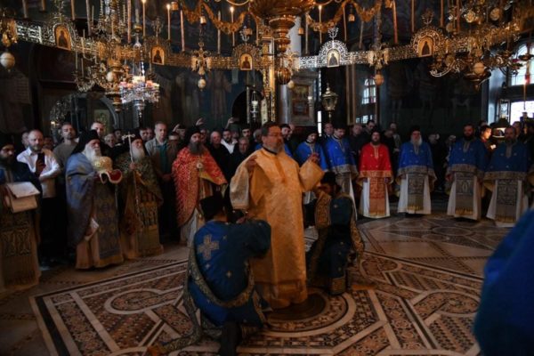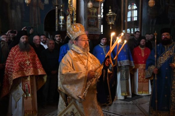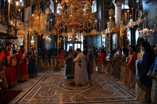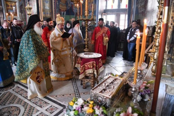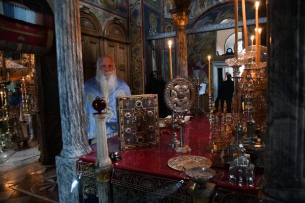 A festal meal followed, and at 7:00 p.m. began the all-night vigil of the feast, presided over by His Eminence Metropolitan Theoliptos. On the right choir chanted the fathers of Vatopedi, as they do each year, while on the left sang the chanters’ choir of Mr. Konstantinos Marinopoulos from Katerini.
