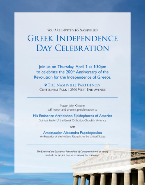 Hosted by the National Coordinating Committee, on April 1st, 2021, His Eminence Archbishop Elpidophoros will receive a Proclamation of Greek Independence from the State of Tennessee from Governor Bill Lee at the Parthenon in Nashville. The event will be live streamed on GOARCH Youtube and social channels.