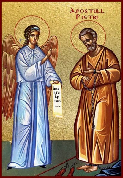Rreth vitit 43, mbreti i judenjve, Herod Agripa, kur pa se predikimi i apostujve po merrte përhapje të gjerë, u hakmor mizorisht kundër të krishterëve, ku mbeti i vrarë me shpatë edhe shën Jakovi, vëllai i Joanit (30 prill). Meqenëse kjo u pëlqeu judenjve, arrestoi edhe apostull Petron, korifeun, e futi në burg, deri në çastin e lirimit të një prej të burgosurve për kënaqësinë e popullit pas Pashkës. Nga frika se mos arratisej, apostull Petron e kishin lidhur me dy zinxhirë të rëndë hekuri dhe i kishin vënë ta ruanin dy ushtarë. Por po atë natë, falë lutjeve të Kishës, Perëndia dërgoi tek ai një engjëll, që e mbushi qelinë me dritë. E shkundi apostullin që po dremiste, e ngriti, dhe sa hap e mbyll sytë zinxhirët ranë nga duart e tij. Pa kuptuar mirë se çfarë ndodhi, Petroja ngjeshi rripin, veshi sandalet dhe, i udhëhequr nga engjëlli, kapërceu pa pengesë gjithë portat. Kur arriti në qytet, engjëlli që tashmë e kishte mbaruar detyrën e tij, e la apostullin. Ai vrapoi për në shtëpinë e Marisë, nënës së Joanit, të mbiquajtur Mark, ku të krishterët e pritën me shumë gëzim (Vep. 12.1-19).