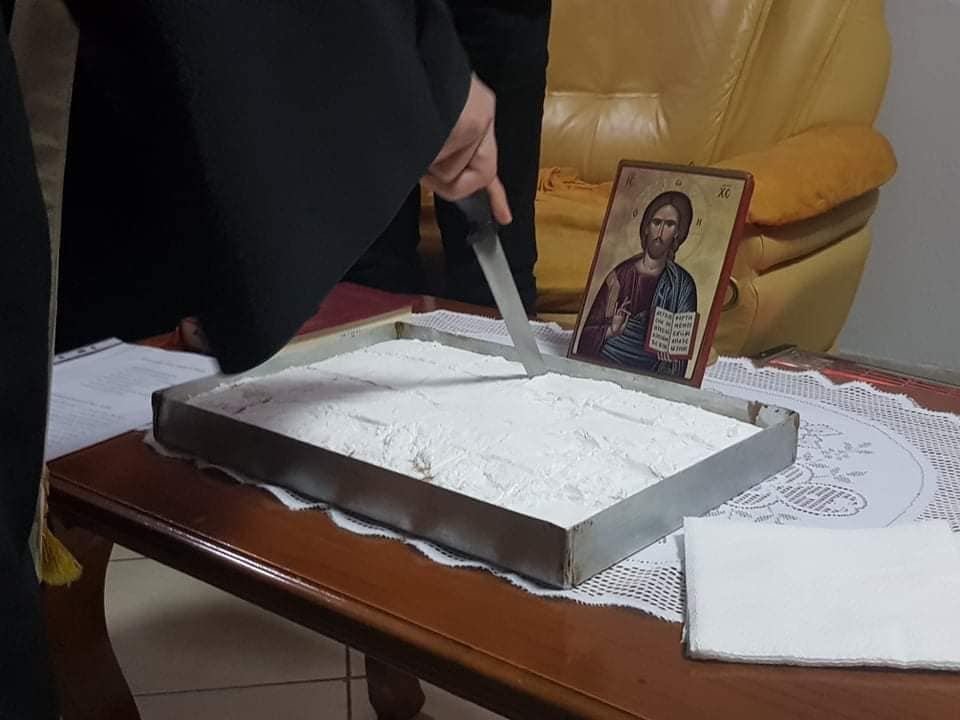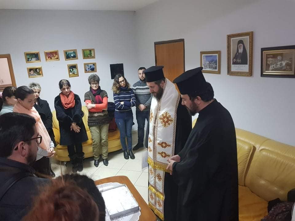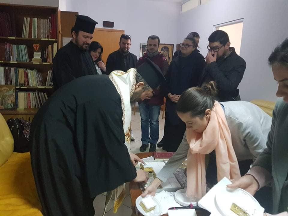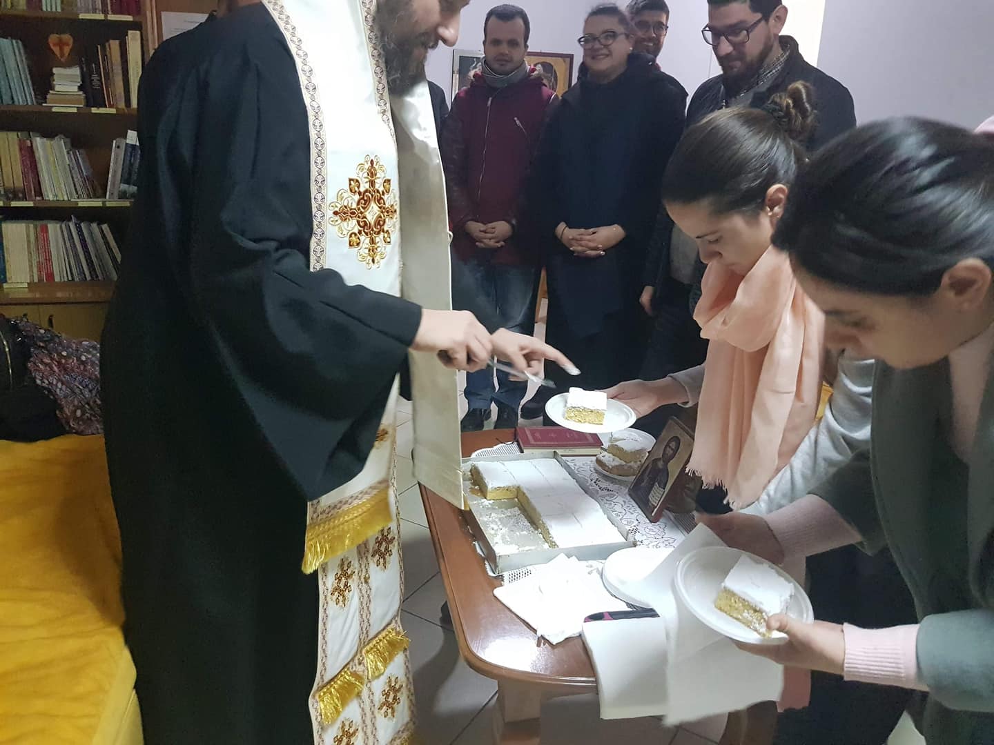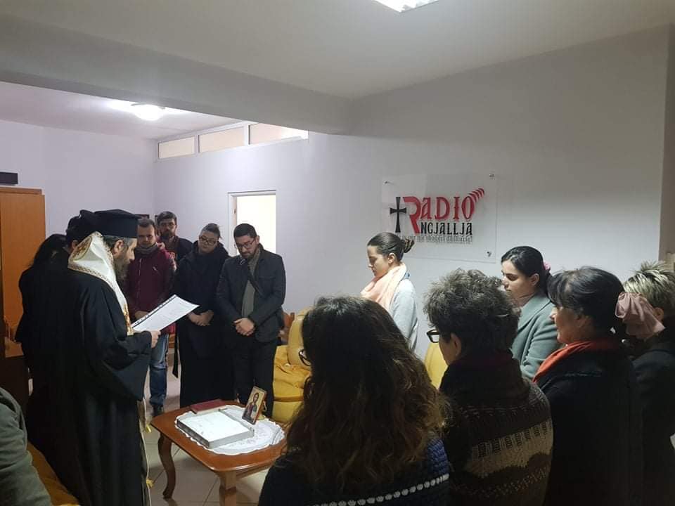 Në prerjen e kekut të “Shën Vasilit” në ambientet e Radio “Ngjallja”. I pranishëm Episkopi i Bylisit, Hirësi Asti. Mirënjohje për gjithë këta të rinj që kontribuojnë vullnetarisht për Radion e Kishës sonë.