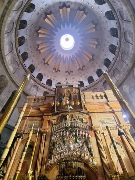 Potrivit tradiției creștine, Biserica „Sfântului Mormânt” se află pe locul răstignirii lui Iisus Hristos, denumit Golgota, cuprinzând și mormântul din apropiere.