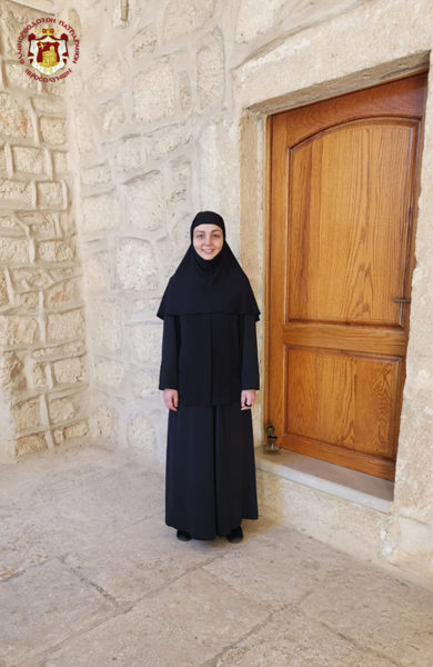 The tonsure was held by her spiritual Father, the Hegoumen of the Monastery of the Shepherds, Archimandrite Ignatios, in the presence of the Abess of the Monastery of Megali Panagia, Nun Melani, where the newly tonsured nun lives, her brother, Archimandrite Polykarpos, who serves as a Sacristan at the Basilica of the Nativity in Bethlehem and her mother Vasiliki.