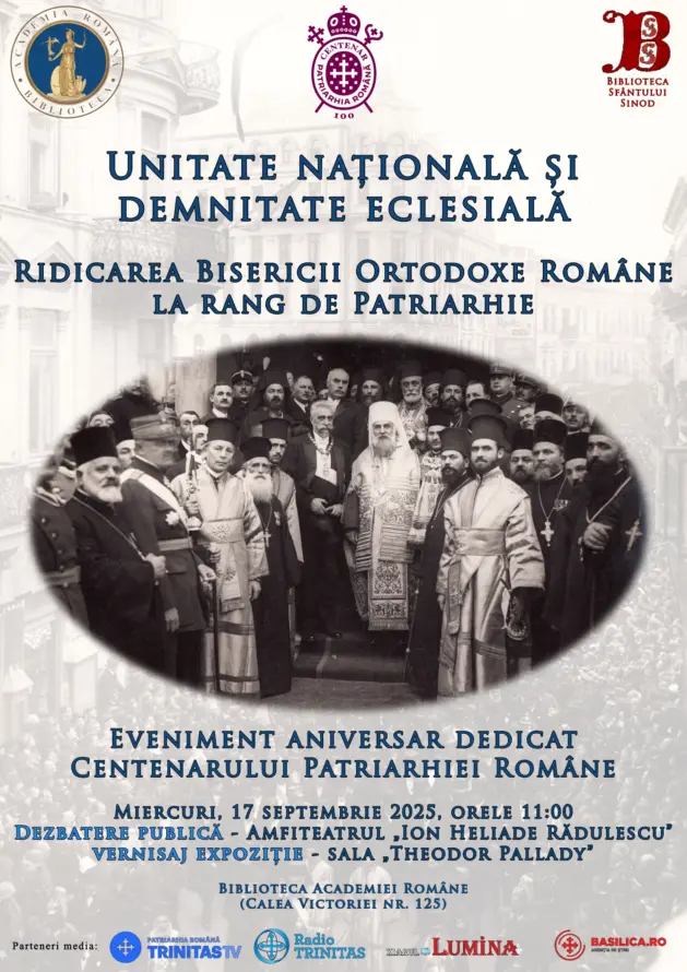 15/09/2025 15/09/2025 La Biblioteca Academiei Române va fi prezentată miercuri Expoziția „Unitate națională și demnitate eclesială – Ridicarea Bisericii Ortodoxe Române la rang de patriarhie”. Cu această ocazie, de la ora 11:00, se va desfășura o dezbatere publică în amfiteatrul „Ion Heliade Rădulescu”. Evenimentul va fi deschis de prof. ing. Nicolae Noica, Directorul Bibliotecii Academiei Române. Expoziția...
