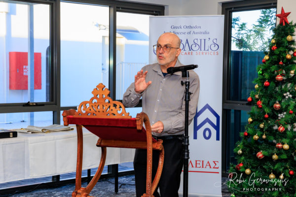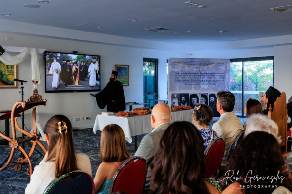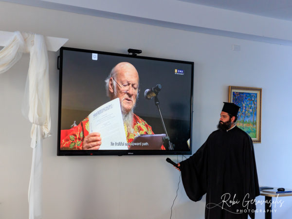 At the end of the blessing, His Grace read the Message of His Eminence Archbishop Makarios of Australia “on the occasion of the beginning of the New Year 2025 and the cutting of the Vasilopita”. This was then followed with the playing of the video produced by the “Vema” on His All-Holiness Ecumenical Patriarch Bartholomew’s recent Apostolic Visit to Australia.