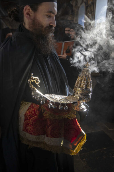 A monk with a katzio in the refectory of the Vatopedi monastery, Mount Athos.